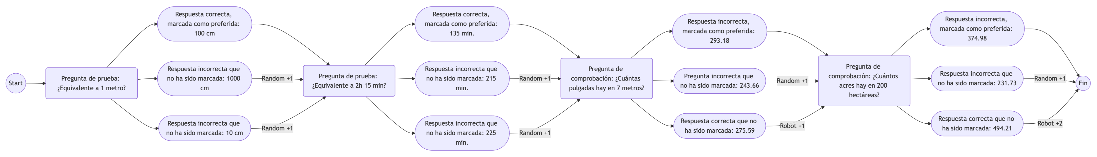 Idealmente, cada una de estas áreas se correspondería con una sección en la aplicación. Para considerar que el usuario es un robot, tendría que fallar pruebas en varias secciones. El usuario puede acumular dos tipos de fallos. Cuando responde de la misma forma que un robot lo haría, sube el marcador Robot. Cuando responde de manera errática, aleatoria o ilógica, sube el marcador Random.El marcador Random no demuestra que el usuario sea un robot: tanto personas como máquinas podemos responder de manera aparentemente ilógica si no sabemos la respuesta o queremos terminar cuanto antes. Por eso, si el usuario acumula demasiados puntos en el marcador Random el test debería ser desestimado.El sistema numérico permitiría, además, hacer pequeños ajustes tras probar el sistema. No todos los fallos o aciertos tienen por qué tener el mismo valor, y como no hemos probado el sistema no sabemos qué partes del test funcionan mejor. Podrían desarrollarse e incorporarse otros muchos juegos al test para añadir variedad, y así las pruebas no serían siempre las mismas ni aparecerían siempre en el mismo orden. De esta forma, además, el programa podría sugerir pruebas alternativas si con la primera ronda no ha llegado a una conclusión clara.